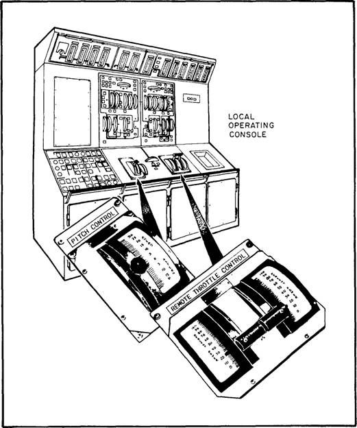 LOCAL CONTROL CONSOLE The local control console is a secondary operating station. It is located in the engine room near the propulsion equipment. It controls and contains the necessary controls and indicators to permit direct local (manual) control of the propulsion equipment. The direct local mode of control, although still electronic, permits operation of the equipment in a manual mode. The local control console provides facilities for local control of plant starting, normal operation, monitoring, and stopping. Figure 6-24 shows propulsion control stations including the local operating console. The two main controls on this console are the remote throttle control and the pitch control. The remote throttle provides control of the power produced by the gas turbine engine. This control is graduated in percent of gas
