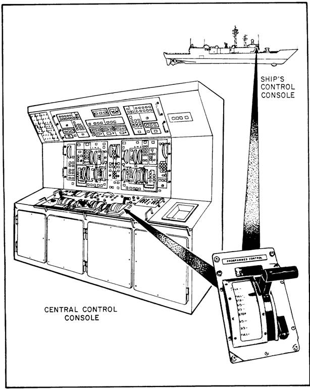 turbine engine speed and has control levers similar to an airplane throttle. The pitch lever provides control of the propeller pitch angle. By varying the pitch angle, the ship's speed may be changed. The pitch lever is graduated in feet of pitch either ahead or astern. |