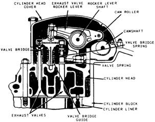 VALVE MECHANISM The valve mechanism of a two-stroke diesel cylinder head is shown in figure 7-7 This cylinder head has two exhaust valves that are opened at the same time by the action of a single cam. They make a tight fit in the exhaust openings (ports) in the cylinder head and are held in the closed position by the compression of the valve springs. The rocker arm and bridge transmit the reciprocating motions of the cam roller to the valves.