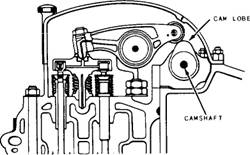 B. EXHAUST OPEN Figure 7-7.-A two-stroke diesel cylinder head, showing the valve-operating mechanism. In figure 7-7 view A, the cam roller is riding on the base circle of the cam, and the valves are closed. As the camshaft rotates, the cam lobe or nose rides under the roller and raises it to the position shown in view B. When the roller is lifted, the arm rotates around the rocker shaft; and the opposite end of the arm is lowered. This action pushes the bridge and valves down against the pressure of the valve springs and opens the valve passages. On some types of engines, the camshaft is located near the crankshaft. In these designs, the action of the cam roller is transmitted to the rocker arm by a pushrod. The camshaft must be timed with the crankshaft so that the lobes will open the valves in each cylinder at the correct instant in the operating cycle. In the two-stroke engine, the camshaft rotates at the same speed as the crankshaft. The four-stroke engine has an intake valve and an exhaust valve in every cylinder. Each valve is