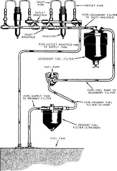 Figure 7-8.-The fuel supply system of a typical diesel engine. operated by a separate cam. The intake valve is held open during the intake stroke, and the exhaust valve is opened during the exhaust stroke. Since two revolutions of the crankshaft are necessary to complete a cycle, the camshaft of these engines turns only half as fast as the crankshaft. |