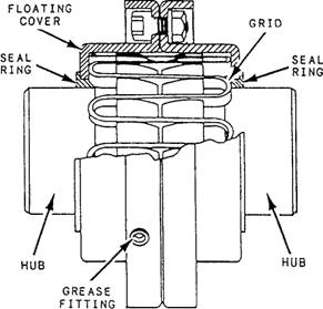Figure 9-15.-Grid-type flexible coupling. (fig 9-15) is intended to take care of only a slight misalignment. Misalignment should never exceed the amount specified by the pump manufacturer. If the misalignment is excessive, the coupling parts are subjected to severe punishment, necessitating frequent replacement of pins, bushings, and bearings. It is absolutely necessary to have the rotating shafts of the driver and driven units in proper alignment. Figure 9-16 shows coupling alignment. You should check the shaft alignment when the pump is opened for repair or maintenance, or if a noticeable vibration occurs. You must realign the unit if the shafts are out of line or inclined at an angle to each other. Whenever practicable, check the alignment with all piping in place and with the adjacent tanks and piping filled. When the driving unit is connected to the pump by a FLANGE COUPLING, the shafting may require frequent realignment, which may be indicated by high temperatures, noises, and worn bearings or bushings. Wedges, or shims, are sometimes placed under the bases of both the driven and driving units (fig 9-16 view A) for ease in alignment when the machinery is installed. When the wedges or other packing have been adjusted so the outside diameters and faces of the coupling flanges run true as they are manually revolved, the chocks are fastened, the units are securely bolted to the foundation, and the coupling flanges are bolted together. The faces of the coupling flanges should be checked at 90-degree intervals. This method is shown in figure 9-16 view B. Find the distances between the faces at point a, point b (on the