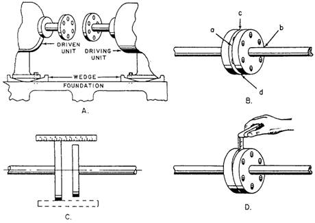 opposite side), point c, and point d (opposite point c). This action will show whether the coupling faces are parallel to each other. If they are not parallel to each other, adjust the driving unit or the pump with shims until the couplings check true. While measuring the distances, you must keep the outside diameters of the coupling flanges in line. To do this, place the scale across the two flanges, as shown in figure 9-16 view C. If the flanges do not line up, raise or lower one of the units with shims, or shift them sideways. The procedure for using a thickness gauge to check alignments is similar to that for a scale. When the outside diameters of the coupling flanges are not the same, use a scale on the surface of the larger flange, and then use a thickness gauge between the surface of the smaller flange and the edge of the scale. When the space is narrow, check the distance between the coupling flanges with a thickness gauge, as shown in figure 9-16 view D. Check wider spaces with a piece of square key stock and a thickness gauge. |