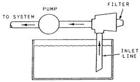 Figure 9-41.-Inlet strainer. the various micron sizes with mesh and standard sieve sizes. A simple screen or a wire strainer is rated for filtering fineness by a MESH number or its near equivalent, STANDARD SIEVE number. The higher the mesh or sieve number, the finer the screen. When a filter is specified as so many microns, it usually refers to the filter's NOMINAL rating. A filter nominally rated at 10 microns, for example, would trap most particles 10 microns in size or larger. The filter's ABSOLUTE rating, however, would be a somewhat higher size, perhaps 25 microns. The absolute rating is the size of the largest opening or pore in the filter. Absolute rating is an important factor only when it is mandatory that no particles above a given size be allowed to circulate in the system. |