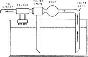 FILTER/STRAINER LOCATION There are three general areas in a system for locating a filter: the inlet line, the pressure line, or a return line. Both filters and strainers are available for inlet lines. Filters are normally used in other lines. Inlet Filters and Strainers Figure 9-40 shows the location of an inlet line filter. An inlet line filter is usually a relatively coarse mesh filter. A fine mesh filter (unless it is very large) creates more pressure drop than can be tolerated in an inlet line. Figure 9-41 shows a typical strainer of the type installed on pump inlet lines inside a reservoir. It is relatively coarse as filters go, being constructed of fine mesh wire. A 100-mesh strainer protects the pump from particles about 150 microns in size. Pressure Line Filters A number of filters are designed for installation right in the pressure line (fig 9-42) and can trap much smaller particles than inlet line