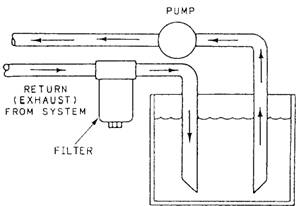 Figure 9-43.-Return line filter. filters. Such a filter might be used where system components, such as valves, are less dirt-tolerant than the pump. The filter thus would trap this fine contamination from the fluid as it leaves the pump. Pressure line filters must be able to withstand the operating pressure of the system. Return Line Filters Return line filters fig 9-43 also can trap very small particles before the fluid returns to the reservoir/tank. They are particularly useful in systems that do not have large reservoirs/tanks to allow contaminants to settle out of the fluid. A return line filter is nearly a must in a system with a high-performance pump, which has very close clearances and usually cannot be sufficiently protected by an inlet line filter. |