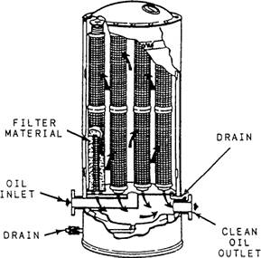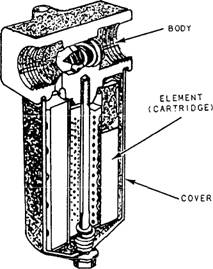 Figure 9-44.-Filter assembly using a surface-type element. Paper filters are usually resin-impregnated for strength. Adsorbent (or active) filters, such as charcoal and fuller's earth, are used mostly in gaseous or vapors systems. This type of filter material should not be used in hydraulic systems since they remove essential additives from the hydraulic fluid. CONSTRUCTION OF FILTER ELEMENTS Filter elements are constructed in various ways. The three most common filter element construction types are the surface type (most common), the depth type, and the edge type. Surface-type filter elements (fig 9-44) are made of closely woven fabric or treated paper with pores to allow fluid to flow through. Very accurate control of the pore size is a feature of the surface-type elements. A depth-type filter element (fig 9-45) is composed of layers of a fabric or fibers, which provide many tortuous paths for the fluid to flow through. The pores or passages vary in size, and the degree of filtration depends on the flow rate. Increases in flow rate tend to dislodge trapped particles. This filter is limited to low-flow, low pressure-drop conditions.