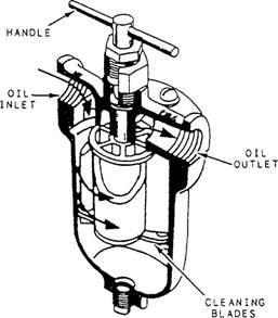 Figure 9-46.-Edge-type filter element. An edge-type filter element fig. 9-46 separates particles rom fluids passing between finely spaced plates. The filter shown features stationary cleaner blades that scrape out the collected contaminants when the handle is twisted to turn the element. |