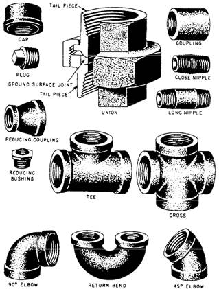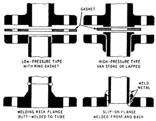 FITTINGS Some type of connector must be provided to attach the pipe, tube, or hose to the other components of the system and to connect sections of the line to each other. There are many different types of connectors (commonly called fittings) provided for this purpose. Some of the most common types of fittings are covered in the following paragraphs. Threaded Joints The threaded joints are the simplest type of pipe fittings. Threaded fittings are not widely used aboard modern ships except in low-pressure water piping systems. The pipe ends connected to the union are threaded, silver-brazed, or welded into the tail pieces (union halves); then the two ends are joined by setting up (engaging and tightening up on) the union ring. The male and female connecting ends of the tail pieces are carefully ground to make a tight metal-to-metal fit with each other. Welding or silver-brazing the ends to the tail pieces prevents contact of the carried fluid or gas with the union threading. Bolted Flange Joints Bolted flange joints (fig 9-53) are suitable for all pressures now in use. The flanges are attached