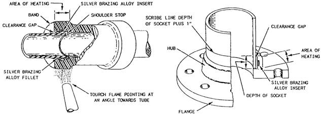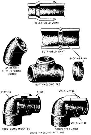 Figure 9-54.-Various types of welded joints. to the piping by welding, brazing, screw threads (for some low-pressure piping), or rolling and bending into recesses. Those shown figure 9-53 are the most common types of flange joints used. Flange joints are manufactured for all standard fitting shapes, such as the tee, cross, elbow, and return bend. The Van Stone and the welded-neck flange joints are used extensively where piping is subjected to high pressures and heavy expansion strains. The design of the Van Stone flange makes it easier to line up the fastening holes in the two parts of the flange. Welded Joints The majority of joints found in subassemblies of piping systems are welded joints, especially in high-pressure piping. The welding is done according to standard specifications, which define the material and techniques. Three general classes of welded joints are fillet-weld, butt-weld, and socket-weld (fig 9-54). Silver-Brazed Joints Silver-brazed joints fig. 9-55 are commonly used for joining nonferrous piping when the pressure and temperature in the lines make their use practicable-temperatures must not exceed 425F; for cold lines, pressure must not exceed 3000 psi. The alloy is melted by heating the joint with an oxyacetylene torch. This causes the molten metal to fill the few thousandths of an inch annular space between the pipe and the fitting. Unions The union fittings are provided in piping systems to allow the piping to be taken down for