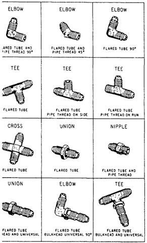 Figure 9-56.-Unions/threaded pipe connectors. repairs and alterations. Unions are available in many different materials and designs to withstand a wide range of pressures and temperatures. Figure 9-56 shows some commonly used types of unions/threaded pipe connectors. The union is most commonly used for joining piping up to 2 inches in size. Flared Fittings Flared fittings are commonly used in tubing lines. These fittings provide safe, strong, dependable connections without the necessity of threading, welding, or soldering the tubing. Flared fittings are made of steel, aluminum alloy, or bronze. Do not mix materials when using these fittings. For example, for steel tubing use only steel fittings and for copper or brass tubing use only bronze fittings, figure 9-57 shows the most common types of flared fittings. Flareless Fittings Flareless fittings (figs. 9-58 and 9-59) are suitable for use in hydraulic service and air