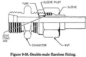 Figure 9-59.-typical flareless fitting. service systems at a maximum operating pressure of 3000 psi and a maximum operating temperature of 250F. Flareless fittings are installed to conserve space and to reduce weight, installation time, and system cleaning time. Do not use flareless fittings if you do not have enough space to properly tighten the nuts or if you have to remove the equipment or piping for access to the fittings. An exception to this rule is a gauge board. It is designed so it may be removed as a unit for repairs or alterations. Do not use flareless fittings where you cannot easily deflect the piping to permit assembly and disassembly. Before assembly, ensure the tubing end is square, concentric, and free of burrs. For an effective fitting, be sure the cutting edge of the sleeve or ferrule bites into the periphery of the tube; you can do this by presetting the ferrule. |