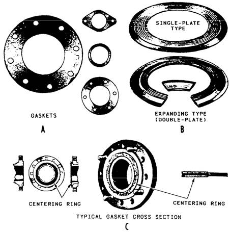 PACKING OF FIXED JOINTS Figure 9-63 shows gasket material used for fixed joints. At one time, fixed joints could be satisfactorily sealed with gaskets of compressed asbestos sheet packing (view A fig 9-63) Today the 15 percent rubber content of the packing makes it unsatisfactory for modern, hightemperature, high-pressure equipment. Two types of gaskets (metallic or semimetallic) are in use in present day high-temperature and high-pressure installations. Gaskets of corrugated copper or of asbestos and copper are sometimes used on lowand medium-pressure lines. Serrated-face metal gaskets (view B of fig 9-63) made of steel, Monel, or soft iron have raised serrations to make a better seal at the piping flange joints. These gaskets have resiliency. Line pressure forces the serrated faces tighter against the adjoining flange. The gaskets shown are of two variations. Spiral-wound, metallic-asbestos gaskets (view C of fig 9-63) are made of interlocked strands of preformed corrugated metal and asbestos strips, spirally wound together (normally called the FILLER), and a solid metal outer or centering