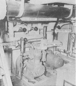 Figure 10-4.-Evaporator tubing. temperature of the available cooling medium, the only way to make the vapor condense is to compress it. When we raise the pressure, we also raise the temperature. Therefore, we have raised its condensing temperature, which allows us to use seawater as a cooling medium in the condenser. In addition to this primary function, the compressor also keeps the refrigerant circulating and maintains the required pressure difference between the high-pressure and low-pressure sides of the system. Many different types of compressors are used in refrigeration systems. The designs of compressors vary depending on the application of the refrigerants used in the system. Figure 10-5 shows a motor-driven, single-acting, two-cylinder, reciprocating compressor, such as those commonly used in naval refrigeration plants. Compressors used in R-12 systems may be lubricated either by splash lubrication or by pressure lubrication. Splash lubrication, which depends on maintaining a fairly high oil level in the compressor crankcase, is usually satisfactory for smaller compressors. High-speed or large-capacity compressors use pressure lubrications systems. |