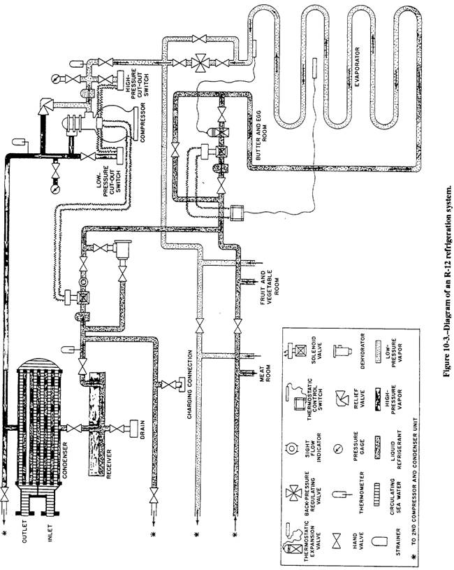 Figure 10-2.-High-pressure side of an R-12 installation aboard ship. Additional equipment required to complete the plant includes piping, pressure gauges, thermometers, various types of control switches and control valves, strainer, relief valves, sight-flow indicators, dehydrators, and charging connections. In this chapter, we will deal with the R-12 system as though it had only one evaporator, one compressor, and one condenser. As you can see from figure 10-3 however, a refrigeration system usually has more than one evaporator, and it may include an additional compressor and condenser units. Thermostatic Expansion Valve (TXV) Earlier, you learned that the TXV regulates the amount of refrigerant to the cooling coil. The amount of refrigerant needed in the coil depends, of course, on the temperature of the space being cooled. The thermal control bulb, which controls the opening and closing of the TXV, is clamped to the cooling coil near the outlet. The substance in the thermal bulb varies, depending on the refrigerant used. The expansion and contraction (because of temperature change) transmit a pressure to the diaphragm. This causes the diaphragm to be moved downward, opening