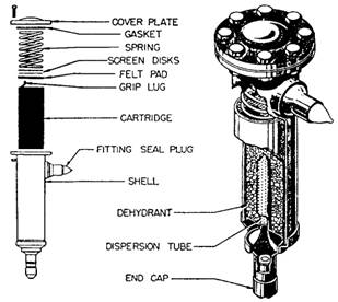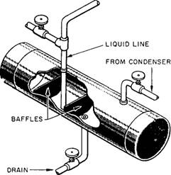 Figure 10-8.-Receiver. Dehydrator A dehydrator, or dryer, containing silica gel or activated alumina, is placed in the liquid refrigerant line between the receiver and the TXV. In older installations, bypass valves allow the dehydrator to be cut in or out of the system. In newer installations, the dehydrator is installed in the liquid refrigerant line without any bypass arrangement. A dehydrator is shown in figure 10-9 Moisture Indicator A moisture indicator is located either in the liquid refrigerant line or built into the dehydrator. The moisture indicator contains a chemically treated element that changes color when there is an increase of moisture in the refrigerant. The color change is reversible and changes back to a DRY reading when the moisture is removed from the refrigerant. Excessive moisture or water will damage the moisture indicator element and turn it gray, which indicates it must be replaced. Solenoid Valve and Thermostatic Control Switch A solenoid valve is installed in the liquid line leading to each evaporator. Figure 10-10 shows a solenoid valve and the thermostatic control switch that operates it. The thermostatic control switch is connected by long flexible tubing to a thermal control bulb located in the refrigerated space. When the temperature in the refrigerated space drops to the desired point, the thermal control bulb causes the thermostatic control switch to