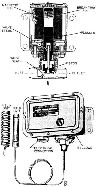 Figure 10-10.-Solenoid valve and thermostatic control switch. open. This action closes the solenoid valve and shuts off all flow of liquid refrigerant to the TXV. When the temperature in the refrigerated space rises above the desired point, the thermostatic control switch closes, the solenoid valve opens, and liquid refrigerant once again flows to the TXV. The solenoid valve and its related thermostatic control switch maintain the proper temperature in the refrigerated space. You may wonder why the solenoid valve is necessary if the TXV controls the amount of refrigerant admitted to the evaporator. Actually, the solenoid valve is not necessary on units that have only one evaporator. In systems that have more than one evaporator and where there is wide variation in load, the solenoid valve provides additional control to prevent the spaces from becoming too cold at light loads. In addition to the solenoid valve installed in the line to each evaporator, a large refrigeration plant usually has a main liquid line solenoid valve installed just after the receiver. If the compressor stops for any reason except normal suction pressure control, the main liquid solenoid valve closes. This prevents liquid refrigerant from flooding the evaporator and flowing to the compressor suction. Extensive damage to the compressor can result if liquid is allowed to enter the compressor suction. Evaporator Pressure Regulating Valve In some ships, several refrigerated spaces of varying temperatures are maintained by one compressor. In these cases, an evaporator pressure regulating valve is installed at the outlet of each evaporator EXCEPT the evaporator in the space in which the lowest temperature is to be maintained. The evaporator pressure regulating valve is set to keep the pressure in the coil from falling below the pressure corresponding to the lowest evaporator temperature desired in that space. The evaporator pressure regulating valve is used * on water coolers, * on units where high humidity is required (such as fruit and vegetable stow spaces), and * in installations where two or more rooms are maintained at different temperatures by the use of the same refrigeration unit. A cross section of a common evaporator pressure regulating valve (commonly called the EPR valve) is shown in figure 10-11. The tension of the spring above the diaphragm is adjusted so that when the evaporator coil pressure drops below the desired minimum, the spring will shut the valve. The EPR valve is not really a temperature control; that is, it does not regulate the temperature in the space. It is only a device to prevent the temperature from becoming too low. Low-Pressure Cutout Switch The low-pressure cutout switch is also known as a suction pressure control switch. This switch is the control that causes the compressor to go on or off as required for normal operation of the refrigeration plant.