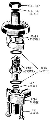 Figure 10-1l.-Exploded view of a typical evaporator pressure regulating valve. It is located on the suction side of the compressor and is actuated by pressure changes in the suction line. When the solenoid valves in the lines to the various evaporators are closed, the flow of refrigerant to the evaporators is stopped. This action causes the pressure of the vapor in the compressor suction line to drop quickly. When the suction pressure has dropped to the desired pressure, the low-pressure cutout switch stops the compressor motor. When the temperature in the refrigerated spaces rises enough to operate one or more of the solenoid valves, refrigerant is again admitted to the cooling coils. This causes the compressor suction pressure to buildup again. At the desired pressure, the low-pressure cutout switch closes, starting the compressor, and the cycle is repeated again. High-Pressure Cutout Switch A high-pressure cutout switch is connected to the compressor discharge line to protect the high-pressure side of the system against excessive pressures. The design of this switch is essentially the same as that of the low-pressure cutout switch. However, the low-pressure cutout switch is made to CLOSE when the suction pressure reaches its upper normal limit, while the high-pressure cutout switch is made to OPEN when the discharge pressure is too high. As you already have learned, the low-pressure cutout switch is the compressor control for the normal operation of the plant. On the other hand, the high-pressure cutout switch is a safety device only. It does not have control of the compressor under normal conditions. Water Failure Switch A water failure switch stops the compressor if there is a circulating water supply failure. The water failure switch is a pressure-actuated switch. Its operation is similar to the low- and high-pressure cutout switches previously described. If the water failure cutout switch fails to function, the refrigerant pressure in the condenser quickly builds up to the point that the high-pressure switch stops the compressor. Strainer Because of the solvent action of R-12, any particles of grit, scale, dirt, or metal that the system may contain are circulated through the refrigerant lines. To avoid damaging the compressor from foreign matter, a strainer is installed in the compressor suction connection. Water Regulating Valve A water regulating valve controls the quantity of circulating water flowing through the refrigerant condenser. The water regulating valve is actuated by the refrigerant pressure in the compressor discharge line. This pressure acts upon a diaphragm (or, in some valves, a bellows arrangement) that transmits motion to the valve stem. The primary function of the water regulating valve is to maintain a constant refrigerant condensing pressure. Basically, the following two variable conditions exist: 1. The amount of refrigerant to be condensed 2. Changing water temperatures The valve maintains a constant refrigerant condensing pressure by controlling the water flow through the condenser. By sensing the refrigerant pressure, the valve permits only enough water through the condenser to condense the amount of refrigerant vapor coming from the compressor. The quantity of water required to condense a given amount of refrigerant varies with the water temperature. Thus, the flow of cooling water through the condenser is automatically maintained at the rate actually required to condense the refrigerant under varying conditions of load and temperature. Pressure Gauges and Thermometers A number of pressure gauges and thermometers are used in refrigeration systems. Figure 10-12 shows a compound R-12 gauge. The temperature markings on this gauge show the boiling point (or condensing point) of the refrigerant at each pressure; the gauge cannot measure temperature directly. The red pointer is a stationary marker that can be set manually to indicate the maximum working pressure. A water pressure gauge is installed in the circulating water line to the condenser to indicate failure of the circulating water supply. Standard thermometers of appropriate range are provided for the refrigerant system. |