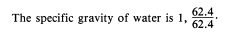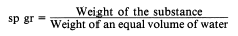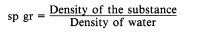 or 62.4 pounds. Therefore, the density of the liquid is 62.4 pounds per cubic foot. This is the density of water at 4C and is usually used as the standard for comparing densities of other substances. The temperature of 4C was selected because water has its maximum density at this temperature. In the metric system, the density of water is 1 gram per cubic centimeter. The standard temperature of 4C is used whenever the density of liquids and solids is measured. Changes in temperature will not change the weight of a substance but will change the volume of the substance by expansion or contraction, thus changing the weight per unit volume. In physics, the word specific implies a ratio. Weight is the measure of the earths attraction for a body. The earths attraction for a body is called gravity. Thus, the ratio of the weight of a unit volume of some substance to the weight of an equal volume of a standard substance, measured under standard pressure and temperature con-ditions, is called specific gravity. The terms specific weight and specific density are sometimes used to express this ratio. The following formulas are used to find the specific gravity (sp gr) of solids and liquids, with water used as the standard substance.