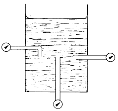 Figure 2-6.Pressure of a liquid is independent of direction. cross-sectional area of the column at that depth. The volume of a liquid that produces the pressure is referred to as the fluid head of the liquid. The pressure of a liquid due to its fluid head is also dependent on the density of the liquid. If we let A equal any cross-sectional area of a liquid column and h equal the depth of the column, the volume becomes Ah. Using equation 2-4, D = W/V, the weight of the liquid above area A is equal to AhD.