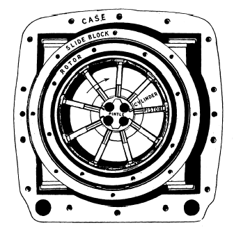 Figure 4-11.Principles of operation of the radial piston pump. cylinder block, which revolves around the pintle and contains the cylinders in which the pistons operate; a rotor, which houses the reaction ring of hardened steel against which the piston heads press; and a slide block, which is used to control the length of the piston strokes. The slide block does not revolve but houses and supports the rotor, which does revolve due to the friction set up by the sliding action between the piston heads and the reaction ring. The cylinder block is attached to the drive shaft.Referring to view A of figure 4-11, assume that space X in one of the cylinders of the cylinder block contains liquid and that the respective piston of this cylinder is at position 1. When the cylinder block and piston are rotated in a clockwise direction, the piston is forced into its cylinder as it approaches position 2. This action reduces the volumetric size of the cylinder and forces a quantity of liquid out of the cylinder and into the outlet port above the pintle. This pumping action is due to the rotor being off-center in relation to the center of the cylinder block.In figure 4-11 view B, the piston has reached position 2 and has forced the liquid out of the open end of the cylinder through the outlet above the pintle and into the system. While the piston moves from position 2 to position 3, the open end of the cylinder passes over the solid part of the pintle; therefore, there is no intake or discharge of liquid during this time. As the piston and cylinder move from position 3 to position 4, centrifugal force causes the piston to move outward against the reaction ring of the rotor. During this time the open end of the cylinder is open to the intake side of the pintle and, therefore, fills with liquid. As the piston moves from position 4 to position 1, the open end of the cylinder is against the solid side of the pintle and no intake or discharge of liquid takes place. After the piston has passed the pintle and starts toward position 2, another discharge of liquid takes place. Alternate intake and discharge continues as the rotor revolves about its axis-intake on one side of the pintle and discharge on the other, as the piston slides in and out. Notice in views A and B of figure 4-11 that the center point of the rotor is different from the center point of the cylinder block. The difference of these centers produces the pumping action. If the rotor is moved so that its center point is the same as that of the cylinder block, as shown in figure 4-11, view C, there is no pumping action, since the piston does not move back and forth in the cylinder as it rotates with the cylinder block. The flow in this pump can be reversed by moving the slide block, and therefore the rotor, to the right so the relation of the centers of the rotor and the cylinder block is reversed from the position shown in views A and B of figure 4-11. View D shows this arrangement. Liquid enters the cylinder as the piston travels from position 1 to position 2 and is discharged from the cylinder as the piston travels from position 3 to 4. In the illustrations the rotor is shown in the center, the extreme right, or the extreme left in relation to the cylinder block. The amount of adjustment in distance between the two centers determines the length of the piston stroke, which controls the amount of liquid flow in and out of the cylinder. Thus, this adjustment determines the displacement of the pump; that is, the volume of liquid the pump delivers per revolution. This adjustment may be controlled in different ways. Manual control by a handwheel is the simplest. The pump illustrated in figure 4-11 is controlled in this way. For automatic control of delivery to accommodate varying volume requirements during the operating cycle, a hydraulically controlled cylinder may be used to position the slide block. A gear-motor controlled by a push button or a limit switch is sometimes used for this purpose. Figure 4-11 is shown with four pistons for the sake of simplicity. Radial pumps are actually designed with an odd number of pistons (fig. 4-12). This is to ensure that no more than one cylinder is completely blocked by the pintle at any one time. If there were an even number of pistons spaced evenly around the cylinder block (for example, eight), there would be occasions when two of the cylinders would be blocked by the pintle, while at other times none would be blocked. This would cause three cylinders to discharge at one time and four at one time, causing pulsations in flow. With an odd number of pistons spaced evenly around the cylinder block, only one cylinder is completely blocked by the pintle at any one time. This reduces pulsations of flow.