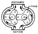 Figure 4-7.Lobe pump. previously. The lobes are considerably larger than gear teeth, but there are only two or three lobes on each rotor. A three-lobe pump is illustrated in figure 4-7. The two elements are rotated, one directly driven by the source of power, and the other through timing gears. As the elements rotate, liquid is trapped between two lobes of each rotor and the walls of the pump chamber and carried around from the suction side to the discharge side of the pump. As liquid leaves the suction chamber, the pressure in the suction chamber is lowered, and additional liquid is forced into the chamber from the reservoir.The lobes are constructed so there is a continuous seal at the points where they meet at the center of the pump. The lobes of the pump illustrated in figure 4-7 are fitted with small vanes at the outer edge to improve the seal of the pump. Although these vanes are mechanically held in their slots, they are, to some extent, free to move outward. Centrifugal force keeps the vanes snug against the chamber and the other rotating members.SCREW PUMP Screw pumps for power transmission systems are generally used only on submarines. Although low in efficiency and expensive, the screw pump is suitable for high pressures (3000 psi), and delivers fluid with little noise or pressure pulsation.Screw pumps are available in several different designs; however, they all operate in a similar manner. In a fixed-displacement rotary-type screw pump (fig. 4-8, view A), fluid is propelled axially