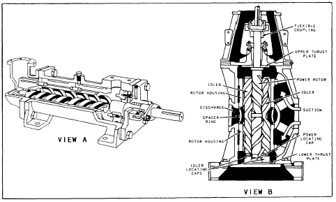 Figure 4-8.Screw pumps. in a constant, uniform flow through the action of just three moving parts-a power rotor and two idler rotors. The power rotor is the only driven element, extending outside the pump casing for power connections to an electrical motor. The idler rotors are turned by the power rotor through the action of the meshing threads. The fluid pumped between the meshing helical threads of the idler and power rotors provides a protective film to prevent metal-to-metal contact. The idler rotors perform no work; therefore, they do not need to be connected by gears to transmit power. The enclosures formed by the meshing of the rotors inside the close clearance housing contain the fluid being pumped. As the rotors turn, these enclosures move axially, providing a continuous flow. Effective performance is based on the following factors:1. The rolling action obtained with the thread design of the rotors is responsible for the very quiet pump operation. The symmetrical pressure loading around the power rotor eliminates the need for radial bearings because there are no radial loads. The cartridge-type ball bearing in the pump positions the power rotor for proper seal operation. The axial loads on the rotors created by discharge pressure are hydraulically balanced.2. The key to screw pump performance is the operation of the idler rotors in their housing bores. The idler rotors generate a hydrodynamic film to support themselves in their bores like journal bearings. Since this film is self-generated, it depends on three operating characteristics of the pumpspeed, discharge pressure, and fluid viscosity. The strength of the film is increased by increasing the operating speed, by decreasing pressure, or by increasing the fluid viscosity. This is why screw pump performance capabilities are based on pump speed, discharge pressure, and fluid viscosity.The supply line is connected at the center of the pump housing in some pumps (fig. 4-8, view B). Fluid enters into the pumps suction port, which opens into chambers at the ends of the screw assembly. As the screws turn, the fluid flows between the threads at each end of the assembly. The threads carry the fluid along within the housing toward the center of the pump to the discharge port.VANE PUMP Vane-type hydraulic pumps generally have circularly or elliptically shaped interior and flat end plates. (Figure 4-9 illustrates a vane pump with a circular interior.) A slotted rotor is fixed to a shaft that enters the housing cavity through one of the end plates. A number of small rectangular plates or vanes are set into the slots of the rotor. As the rotor turns, centrifugal force causes the outer edge of each vane to slide along the surface of the housing cavity as the vanes slide in and out of the rotor slots. The numerous cavities, formed by the vanes, the end plates, the housing, and the rotor, enlarge and shrink as the rotor and vane assembly rotates. An inlet port is installed in the housing so fluid may flow into the cavities as they enlarge. An outlet port is provided to allow the fluid to flow out of the cavities as they become small.The pump shown in figure 4-9 is referred to as an unbalanced pump because all of the pumping action takes place on one side of the rotor. This causes a side load on the rotor. Some vane pumps are constructed with an elliptically shaped housing that forms two separate pumping areas on opposite sides of the rotor. This cancels out the side loads; such pumps are referred to as balanced vane.Usually vane pumps are fixed displacement and pump only in one direction. There are, however, some designs of vane pumps that provide variable flow. Vane pumps are generally restricted to service where pressure demand does not exceed 2000 psi. Wear rates, vibration, and noise levels increase rapidly in vane pumps as pressure demands exceed 2000 psi. RECIPROCATING PUMPS The term reciprocating is defined as back-and-forth motion. In the reciprocating pump it is this