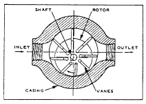 Figure 4-9.Vane pump. back-and-forth motion of pistons inside of cylinders that provides the flow of fluid. Reciprocating pumps, like rotary pumps, operate on the positive principlethat is, each stroke delivers a definite volume of liquid to the system.The master cylinder of the automobile brake system, which is described and illustrated in chapter 2, is an example of a simple reciprocating pump. Several types of power-operated hydraulic pumps, such as the radial piston and axial piston, are also classified as reciprocating pumps. These pumps are sometimes classified as rotary pumps, because a rotary motion is imparted to the pumps by the source of power. However, the actual pumping is performed by sets of pistons reciprocating inside sets of cylinders.HAND PUMPS There are two types of manually operated reciprocating pumpsthe single-action and the double-action. The single-action pump provides flow during every other stroke, while the double-action provides flow during each stroke. Single-action pumps are frequently used in hydraulic jacks.A double-action hand pump is illustrated in figure 4-10. This type of pump is used in some aircraft hydraulic systems as a source of hydraulic power for emergencies, for testing certain subsystems during preventive maintenance inspections, and for determining the causes of malfunctions in these subsystems.This pump (fig. 4-10) consists of a cylinder, a piston containing a built-in check valve (A), a piston rod, an operating handle, and a check valve (B) at the inlet port. When the piston is moved