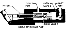 Figure 4-10.Hydraulic hand pump. to the left, the force of the liquid in the outlet chamber and spring tension cause valve A to close. This movement causes the piston to force the liquid in the outlet chamber through the outlet port and into the system. This same piston movement causes a low-pressure area in the inlet chamber. The difference in pressure between the inlet chamber and the liquid (at atmospheric pressure) in the reservoir acting on check valve B causes its spring to compress; thus, opening the check valve. This allows liquid to enter the inlet chamber.When the piston completes this stroke to the left, the inlet chamber is full of liquid. This eliminates the pressure difference between the inlet chamber and the reservoir, thereby allowing spring tension to close check valve B. When the piston is moved to the right, the force of the confined liquid in the inlet chamber acts on check valve A. This action compresses the spring and opens check valve A which allows the liquid to flow from the intake chamber to the outlet chamber. Because of the area occupied by the piston rod, the outlet chamber cannot contain all the liquid discharged from the inlet chamber. Since liquids do not compress, the extra liquid is forced out of the outlet port into the system.PISTON PUMPS Piston pumps are made in a variety of types and configurations. A basic distinction is made between axial and radial pumps. The axial piston pump has the cylinders parallel to each other and the drive shaft. The radial piston design has the cylinders extending radially outward from the drive shaft like the spokes of a wheel. A further distinction is made between pumps that provide a fixed delivery and those able to vary the flow of the fluid. Variable delivery pumps can be further divided into those able to pump fluid from zero to full delivery in one direction of flow and those able to pump from zero the full delivery in either direction.All piston pumps used in Navy shipboard systems have the cylinders bored in a cylinder block that is mounted on bearings within a housing. This cylinder block assembly rotates with the pump drive shaft.Radial Piston Pumps Figure 4-11 illustrates the operation of the radial piston pump. The pump consists of a pintle, which remains stationary and acts as a valve; a
