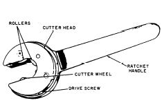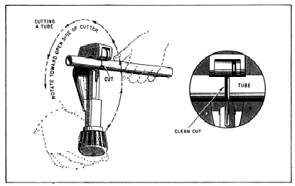 Tube Cutting and Deburring The objective of cutting tubing is to produce a square end that is free from burrs. Tubing may be cut using a standard tube cutter (fig. 5-3), a chipless cutter (fig. 5-4), or a fine-toothed hacksaw if a tube cutter is not available. When you use the standard tube cutter, place the tube in the cutter with the cutting wheel at the point where the cut is to be made. Apply light pressure on the tube by tightening the adjusting