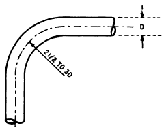 Figure 5-2.Ideal bend radius. knob. Too much pressure applied to the cutting wheel at onetime may deform the tubing or cause excessive burrs. Rotate the cutter toward its open side (fig. 5-3). As you rotate the cutter, adjust the tightening knob after each complete turn to maintain light pressure on the cutting wheel. When you use the chipless cutter, take the following steps:1. Select the chipless cutter according to tubing size. 2. Rotate the cutter head to accept the tubing in the cutting position. Check that the cutter ratchet is operating freely and that the cutter wheel is clear of the cutter head opening (fig. 5-4). 3. Center the tubing on two rollers and the cutting blade. 4. Use the hex key provided with the kit to turn the drive screw in until the cutter wheel touches the tube.
