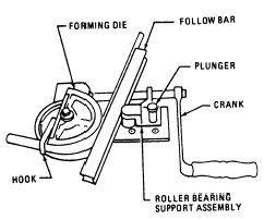 Figure 5-7.Mechanically operated tube bender. slide bar is moved around until the mark on the slide bar reaches the desired degree of bend on the radius block. See figure 5-6 for the six procedural steps in tube bending with the hand-operated tube bender.MECHANICAL TUBE BENDER. The tube bender shown in figure 5-7 is issued as a kit. The kit contains the equipment necessary for bending tubing from 1/4 inch to 3/4 inch in diameter.This tube bender is designed for use with aircraft grade, high-strengths stainless-steel tubing, as well as all other metal tubing. It is designed to be fastened to a bench or tripod. The base is formed to provide a secure grip in a vise. This type of tube bender uses a hand crank and gears. The forming die is keyed to the drive gear and is secured by a screw.The forming die on the mechanical tube bender is calibrated in degrees, similarly to the radius block of the hand bender. A length of replacement tubing may be bent to a specified number of degrees or it may be bent to duplicate a bend either in a damaged tube or in a pattern. Duplicating a bend of a damaged tube or of a pattern is done by laying the sample or pattern on top of the tube being bent and slowly bending the new tube to the required bend.Tube Flaring Tube flaring is a method of forming the end of a tube into a funnel shape so it can be held by a threaded fitting. When a flared tube is prepared, a flare nut is slipped onto the tube and the end of the tube is flared. During tube installation, the flare is seated to a fitting with the inside of the flare against the cone-shaped end of the fitting, and the flare nut is screwed onto the fitting, pulling the inside of the flare against the seating surface of the fitting.Either of two flaring tools (fig. 5-8) may be used. One gives a single flare and the other gives a double flare. The flaring tool consists of a split die block that has holes for various sizes of tubing,