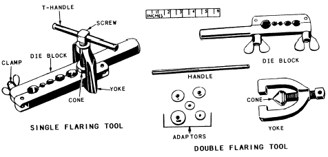 Figure 5-8.Flaring tools. a clamp to lock the end of the tubing inside the die block, and a yoke with a compressor screw and cone that slips over the die block and forms the 45-degree flare on the end of the tube. The screw has a T-handle. A double flaring tube has adaptors that turn in the edge of the tube before a regular 45-degree double flare is made. To use the single flaring tool, first check to see that the end of the tubing has been cut off squarely and has had the burrs removed from both inside and outside. Slip the flare nut onto the tube before you make the flare. Then, open the die block. Insert the end of the tubing into the hole corresponding to the OD of the tubing so that the end protrudes slightly above the top face of the die blocks. The amount by which the tubing extends above the blocks determines the finished diameter of the flare. The flare must be large enough to seat properly against the fitting, but small enough that the threads of the flare nut will slide over it. Close the die block and secure the tool with the wing nut. Use the handle of the yoke to tighten the wing nut. Then place the yoke over the end of the tubing and tighten the handle to force the cone into the end of the tubing. The completed flare should be slightly visible above the face of the die blocks. |