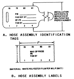 IDENTIFICATION The final step after fabrication and satisfactory testing of a hose assembly is the attachment of identification tags as shown in figure 5-11 (for ships) and in figure 5-12 (for aircraft). The tag shown in figure 5-12, view B, is used in areas where a tag maybe drawn into an engine intake. Hose assemblies to be installed in aircraft fuel and oil tanks are marked with an approved electric engraver on the socket-wrench flats with the required information.