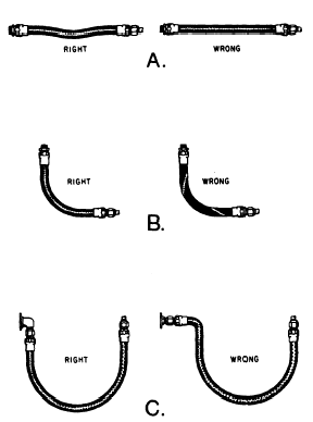 Figure 5-12. Hose assembly identification tags (aircraft). INSTALLATION Flexible hose must not be twisted during installation, since this reduces the life of the hose considerably and may cause the fittings to loosen as well. You can determine whether or not a hose is twisted by looking at the layline that runs along the length of the hose. If the layline does not spiral around the hose, the hose is not twisted. If the layline does spiral around the hose, the hose is twisted (fig. 5-13, view B) and must be untwisted. Flexible hose should be protected from chafing by using a chafe-resistant covering wherever necessary. The minimum bend radius for flexible hose varies according to the size and construction of the hose and the pressure under which the system operates. Current applicable technical publications contain tables and graphs showing minimum bend radii for the different types of installations. Bends that are too sharp will reduce the bursting pressure of flexible hose considerably below its rated value. Flexible hose should be installed so that it will be subjected to a minimum of flexing during operation. Support clamps are not necessary with short installations; but for hose of considerable length (48 inches for example), clamps should be placed not more than 24 inches apart. Closer supports are desirable and in some cases may be required.