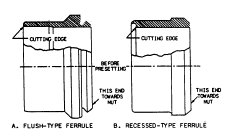 Figure 5-19. Unused ferrules. caused personnel injury, damage to equipment, and unnecessary interruption of propulsion power.1. Cut the tubing square and lightly deburr the inside and outside corners. For corrosion resisting steel (CRES) tubing, use a hacksaw rather than a tubing cutter to avoid work hardening the tube end. For CRES, and if necessary for other materials, dress the tube end smooth and square with a file. Tube ends with irregular cutting marks will not produce satisfactory seating surface impressions.2. Test the hardness of the ferrule by making a light scratch on the tubing at least 1/2 inch back from the tube end, using a sharp corner on the ferrule. If the ferrule will not scratch the tube, no bite will be obtained. This test maybe omitted for flush-type ferrules where the bite will be visible. Moderate hand pressure is sufficient for producing the scratch.3. Lubricate the nut threads, the ferrule leading and trailing edges, and the preset tool threads with a thread lubricant compatible with the system. Slide the nut onto the tubing so the threads face the tube end. Note whether the ferrule is a flush type or recessed type (fig. 5-19), and slide the ferrule onto the tube so the cutting edge is toward the tube end (large end toward the nut).4. Bottom the end of the tubing in the presetting tool. Slide the ferrule up into the presetting tool, and confirm that the nut can be moved down the tube sufficiently to expose at least 1/8 inch of tubing past the ferrule after the presetting operation (fig. 5-20) to allow for inspection of the ferrule.5. While keeping the tube bottomed in the presetting tool, tighten the nut onto the fitting body until the ferrule just grips the tube by friction. This ring grip point may be identified by lightly turning the tube or the presetting tool and slowly tightening the nut until the tube cannot be turned in the presetting tool by hand. Mark the nut and the presetting tool at this position.6. Tighten the nut according to the number of turns given in table 5-3, depending on tube size.
