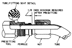 Presetting Presetting consists of deforming the ferrule to bite into the tube OD and deforming the end of the tube to form a shallow conical ring seating surface. The tube and ferrule assembly should be preset in a presetting tool that has an end section identical to a fitting body but which is made of specially hardened steel. This tool hardness is needed to ensure that all deformation at the tube end seat goes into the tube.Presetting is done with a hydraulic presetting tool or a manual presetting tool, either in the shop or aboard ship. The tool vendors instructions must be followed for the hydraulic presetting tool. If a presetting tool is not available, the fitting body intended for installation is used in the same manner as the manual presetting tool. (If an aluminum fitting is used, it should not be reused in the system.) The manual tool is used as follows:WARNING Failure to follow these instructions may result in improperly preset ferrules with insufficient bite into the tube. Improperly preset ferrules have resulted in joints that passed hydrostatic testing and operated for weeks or years, then failed catastrophically under shock, vibration, or normal operat-ing loads. Flareless fitting failures have