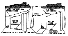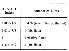 Figure 5-21.Ferrules installed on tube, preset and removed for inspection.b. For recessed-type ferrules, the leading edge must be snug against the tube OD. Determine this visually and by attempting to rock the ferrule on the tube.3. Ensure that the nut end of the ferrule (both types) is collapsed around the tube to provide support against bending loads and vibration.4. The ferrule (both types) must have little or no play along the direction of the tube run. Check this by trying to move the ferrule back and forth by hand. The ferrule will often be free to rotate on the tubing; this does not affect its function.5. For flush-type ferrules, check that the gap between the raised metal ridge and the cutting end of the ferrule stays the same while the ferrule is rotated. (Omit this check for recessed-type ferrules or if the flush-type ferrule will not rotate on the tube).6. Check that the middle portion of the ferrule (both types) is bowed or sprung into an arc. The leading edge of the ferrule may appear flattened into a cone shape; this is acceptable as long as there is a bowed section near the middle of the ferrule. If the whole leading section of the ferrule is flattened into a cone with no bowed section, the ferrule (and possibly the fitting body, if used) has been damaged by overtightening and will not seal reliably.When you make a final assembly in the system, use the following installation procedure: 1. Lubricate all threads with a liquid that is compatible with the fluid to be used in the system.2. Place the tube assembly in position and check for alignment. 3. Tighten the nut by hand until you feel an increase in resistance to turning. This indicates that the sleeve or ferrule pilot has contacted the fitting.4. If possible, use a torque wrench to tighten flareless tubing nuts. Torque values for specific installations are usually listed in the applicable technical publications. If it is not possible to use a torque wrench, use the following procedures for tightening the nuts:After the nut is handtight, turn the nut 1/6 turn (one flat on a hex nut) with a wrench. Use a wrench on the connector to prevent it from turning while tightening the nut. After you install the tube assembly, have the system pressure tested. Should a connection leak, you may tighten the nut an additional 1/6 turn (making a total of 1/3 turn). If, after tightening the nut a total of 1/3 turn, leakage still exists, remove the assembly and inspect the components of the assembly for scores, cracks, presence of foreign material, or damage from overtightening.NOTE: Overtightening a flareless-tube nut drives the cutting edge of the sleeve or ferrule deeply into the tube, causing the tube to be weakened to the point where normal vibration could cause the tube to shear. After you complete the inspection (if you do not find any discrepancies), reassemble the connection and repeat the pressure test procedures.CAUTION: Do not in any case tighten the nut beyond 1/3 turn (two flats on the hex nut); this is the maximum the fitting may be tightened without the possibility of permanently damaging the sleeve or the tube. |