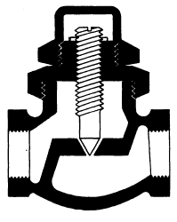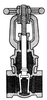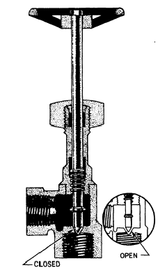 Figure 6-7.Operation of a globe valve. manner. Another reason for not leaving globe valves in the fully open position is that it is sometimes difficult to determine if the valve is open or closed. If the valve is jammed in the open position, the stem may be damaged or broken by someone who thinks the valve is closed, and attempts to open it.It is important that globe valves be installed with the pressure against the face of the disk to keep the system pressure away from the stem packing when the valve is shut.NEEDLE VALVES Needle valves are similar in design and operation to the globe valve. Instead of a disk, a needle valve has a long tapered point at the end of the valve stem. A cross-sectional view of a needle valve is illustrated in figure 6-8. The long taper of the valve element permits a much smaller seating surface area than that of the globe valve; therefore, the needle valve is more suitable as a throttle valve. Needle valves are used to control flow into delicate gauges, which might be damaged by sudden surges of fluid under