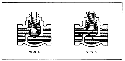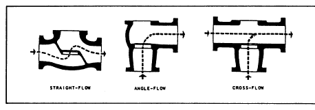 Figure 6-6.Types of globe valve bodies. from the globular shape of the valve body. Other types of valves may also have globular-shaped bodies. Thus, it is the internal structure of the valve that identifies the type of valve. The inlet and outlet openings for globe valves are arranged in a way to satisfy the flow requirements. Figure 6-6 shows straight-, angle-, and cross-flow valves. The moving parts of a globe valve consist of the disk, the valve stem, and the handwheel. The stem connects the handwheel and the disk. It is threaded and fits into the threads in the valve bonnet.The part of the globe valve that controls flow is the disk, which is attached to the valve stem. (Disks are available in various designs.) The valve is closed by turning the valve stem in until the disk is seated into the valve seat. This prevents fluid from flowing through the valve (fig. 6-7, view A). The edge of the disk and the seat are very accurately machined so that they forma tight seal when the valve is closed. When the valve is open (fig. 6-7, view B), the fluid flows through the space between the edge of the disk and the seat. Since the fluid flows equally on all sides of the center of support when the valve is open, there is no unbalanced pressure on the disk to cause uneven wear. The rate at which fluid flows through the valve is regulated by the position of the disk in relation to the seat. The valve is commonly used as a fully open or fully closed valve, but it may be used as a throttle valve. However, since the seating surface is a relatively large area, it is not suitable as a throttle valve, where fine adjustments are required in controlling the rate of flow. The globe valve should never be jammed in the open position. After a valve is fully opened, the handwheel should be turned toward the closed position approximately one-half turn. Unless this is done, the valve is likely to seize in the open position, making it difficult, if not impossible, to close the valve. Many valves are damaged in this