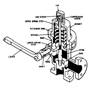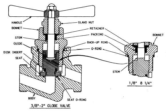 Figure 6-10.Hydraulic and pneumatic globe valve (rising stem). Smaller relief valves, similar in design and operation to the main system relief valve, are often used in isolated parts of the system where a check valve or directional control valve prevents pressure from being relieved through the main system relief valve and where pressures must be relieved at a set point lower than that provided by the main system relief. These small relief valves are also used to relieve pressures caused by thermal expansion (see glossary) of the fluids. Figure 6-11 shows a typical relief valve. System pressure simply acts under the valve disk at the inlet to the valve. When the system pressure exceeds the force exerted by the valve spring, the valve disk lifts off of its seat, allowing some of the system fluid to escape through the valve outlet until the system pressure is reduced to just below the relief set point of the valve.All relief valves have an adjustment for increasing or decreasing the set relief pressure. Some relief valves are equipped with an adjusting screw for this purpose. This adjusting screw is usually covered with a cap, which must be removed before an adjustment can be made. Some type of locking device, such as a lock nut, is usually provided to prevent the adjustment from changing through vibration. Other types of relief valves are equipped with a handwheel for making adjustments to the valve. Either the adjusting screw or the handwheel is turned clockwise to increase the pressure at which the valve will open. In addition, most relief valves are also provided