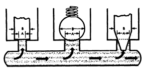 Figure 6-12.Pressure acting on different areas. same pressure acting over different areas produces forces proportional to the areas. It also requires a greater force to close the valve than was required to open it. As a result, the valve will not close until the system pressure has decreased to a certain point below the pressure required to open it. Let us assume that a valve of this type is set to open at 500 psi. (Refer to fig. 6-12.) When the valve is closed, the pressure acts on area A. If this area is 0.5 square inch, an upward force of 250 pounds (500 ~ 0.5) will be exerted on the valve at the moment of opening. With the valve open, however, the pressure acts on area B. If area B is 1 square inch, the upward force is 500 pounds, or double the force at which the valve actually opened. For the valve to close, pressure in the system would have to decrease well below the point at which the valve opened. The exact pressure would depend on the shape of the valve element.In some hydraulic systems, there is a pressure in the return line. This back pressure is caused by restrictions in the return line and will vary in relation to the amount of fluid flowing in the return line. This pressure creates a force on the back of the valve element and will increase the force necessary to open the valve and relieve system pressure.It follows that simple relief valves have a tendency to open and close rapidly as they "hunt" above and below the set pressure, causing pressure pulsations and undesirable vibrations and producing a noisy chatter. Because of the unsatisfactory performance of the simple relief valve in some applications, compound relief valves were developed.Compound relief valves use the principles of operation of simple relief valves for one stage of their actionthat of the pilot valve. Provision is made to limit the amount of fluid that the pilot valve must handle, and thereby avoid the weaknesses of simple relief valves. (A pilot valve is a small valve used for operating another valve.)The operation of a compound relief valve is illustrated in figure 6-13. In view A, the main valve, which consists of a piston, stem, and spring, is closed, blocking flow from the high-pressure line to the reservoir. Fluid in the high-pressure line flows around the stem of the main valves as it flows to the actuating unit. The stem of the main valve is hollow (the stem passage) and contains the main valve spring, which forces the main valve against its seat. When the pilot valve is open the stem passage allows fluid to flow from the pilot