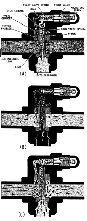 Figure 6-13.Operation of compound relief valve, valve, around the main valve spring, and down to the return line. There is also a narrow passage (piston passage) through the main valve piston. This passage connects the high-pressure line to the valve chamber.The pilot valve is a small, ball-type, spring-loaded check valve, which connects the top of the passage from the valve chamber with the passage through the main valve stem. The pilot valve is the control unit of the relief valve because the pressure at which the relief valve will open depends on the tension of the pilot valve spring. The pilot valve spring tension is adjusted by turning the adjusting screw so that the ball will unseat when system pressure reaches the preset limit.Fluid at line pressure flows through the narrow piston passage to fill the chamber. Because the line and the chamber are connected, the pressure in both are equal. The top and bottom of the main piston have equal areas; therefore, the hydraulic forces acting upward and downward are equal, and there is no tendency for the piston to move in either direction. The only other force acting on the main valve is that of the main valve spring, which holds it closed.When the pressure in the high-pressure line increases to the point at which the pilot valve is set, the ball unseats (fig. 6-13, view B). This opens the valve chamber through the valve stem passage to the low-pressure return line. Fluid immediately begins to flow out of the chamber, much faster than it can flow through the narrow piston passage. As a result the chamber pressure immediately drops, and the pilot valve begins to close again, restricting the outward flow of fluid. Chamber pressure therefore increases, the valve opens, and the cycle repeats.So far, the only part of the valve that has moved appreciably is the pilot, which functions just like any other simple spring-loaded relief valve. Because of the small size of the piston passage, there is a severe limit on the amount of overpressure protection the pilot can provide the system. All the pilot valve can do is limit fluid pressure in the valve chamber above the main piston to a preset maximum pressure, by allowing excess fluid to flow through the piston passage, through the stem passage, and into the return line. When pressure in the system increases to a value that is above the flow capacity of the pilot valve, the main valve opens, permitting excess fluid to flow directly to the return line. This is accomplished in the following manner.As system pressure increases, the upward force on the main piston overcomes the downward force, which consists of the tension of the main piston spring and the pressure of the fluid in the valve chamber (fig. 6-13, view C). The piston then rises, unseating the stem, and allows the fluid to flow from the system pressure line directly into the return line. This causes system pressure to decrease rapidly, since the main valve is designed to handle the complete output of the pump. When the pressure returns to normal, the pilot spring forces the ball onto the seat. Pressures are equal above and below the main piston, and the main spring forces the valve to seat.As you can see, the compound valve over-comes the greatest limitation of a simple relief valve by limiting the flow through the pilot valve to the quantity it can satisfactorily handle. This limits the pressure above the main valve and enables the main line pressure to open the main valve. In this way, the system is relieved when an overload exists. |