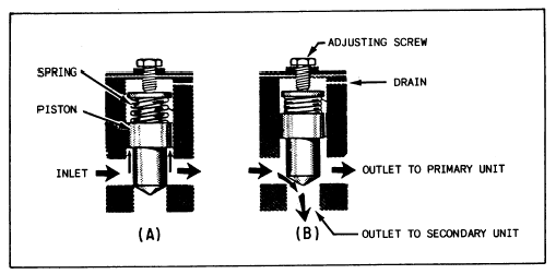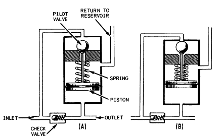 PRESSURE REGULATORS Pressure regulators, often referred to as unloading valves, are used in fluid power systems to regulate pressure. In pneumatic systems, the valve, commonly referred to as a pressure regulator, simply reduces pressure. This type of valve is discussed later in this chapter under pressure-reducing valves. In hydraulic systems the pressure regulator is used to unload the pump and to maintain and regulate system pressure at the desired values. All hydraulic systems do not require pressure regulators. The open-center system (discussed in chapter 12) does not require a pressure regulator. Many systems are equipped with variable-displacement pumps (discussed in chapter 4), which contain a pressure-regulating device.Pressure regulators are made in a variety of types and by various manufacturers; however, the A regulator is open when it is directing fluid under pressure into the system (fig. 6-14, view A). In the closed position (fig. 6-14, view B), the fluid in the part of the system beyond the regulator is trapped at the desired pressure, and the fluid from the pump is bypassed into the return line and back to the reservoir. To prevent constant opening and closing (chatter), the regulator is designed to open at a pressure somewhat lower than the closing pressure. This difference is known as differential or operating range. For example, assume that a pressure regulator is set to open when the system pressure drops below 600 psi, and close when the pressure rises above 800 psi. The differential or operating range is 200 psi.Referring to figure 6-14, assume that the piston has an area of 1 square inch, the pilot valve has a cross-sectional area of one-fourth square inch, and the piston spring provides 600 pounds of force pushing the piston down. When the pressure in the system is less than 600 psi, fluid from the pump will enter the inlet port, flow to the top of the regulator, and then to the pilot valve. When the pressure of the fluid at the inlet increases to the point where the force it creates against the front of the check valve exceeds the force created against the back of the check valve by system pressure and the check valve spring, the check valve opens. This allows fluid to flow into the system and to the bottom of the regulator against the piston. When the force created by the system pressure exceeds the force exerted by the spring, the piston moves up, causing the pilot valve to unseat. Since the fluid will take the path of least resistance, it will pass through the regulator and back to the reservoir through the return line.When the fluid from the pump is suddenly allowed a free path to return, the pressure on the input side of the check valve drops and the check valve closes. The fluid in the system is then trapped under pressure. This fluid will remain pressurized until a power unit is actuated, or until pressure is slowly lost through normal internal leakage within the system.When the system pressure decreases to a point slightly below 600 psi, the spring forces the piston down and closes the pilot valve. When the pilot valve is closed, the fluid cannot flow directly to the return line. This causes the pressure to increase in the line between the pump and the regulator. This pressure opens the check valve, causing the fluid to enter the system.In summary, when the system pressure decreases a certain amount, the pressure regulator will open, sending fluid to the system. When the system pressure increases sufficiently, the regulator will close, allowing the fluid from the pump to flow through the regulator and back to the reservoir. The pressure regulator takes the load off of the pump and regulates system pressure.