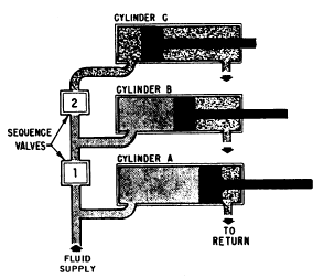 Figure 6-15.Installation of sequence valves. SEQUENCE VALVES Sequence valves control the sequence of operation between two branches in a circuit; that is, they enable one unit to automatically set another unit into motion. An example of the use of a sequence valve is in an aircraft landing gear actuating system.In a landing gear actuating system, the landing gear doors must open before the landing gear starts to extend. Conversely, the landing gear must be completely retracted before the doors close. A sequence valve installed in each landing gear actuating line performs this function. A sequence valve is somewhat similar to a relief valve except that, after the set pressure has been reached, the sequence valve diverts the fluid to a second actuator or motor to do work in another part of the system. Figure 6-15 shows an installation of two sequence valves that control the sequence of operation of three actuating cylinders. Fluid is free to flow into cylinder A. The first sequence valve (1) blocks the passage of fluid until the piston in cylinder A moves to the end of its stroke. At this time, sequence valve 1 opens, allowing fluid to enter cylinder B. This action continues until all three pistons complete their strokes.There are various types of sequence valves. Some are controlled by pressure and some are controlled mechanically.Pressure-Controlled Sequence Valve The operation of a typical pressure-controlled sequence valve is illustrated in figure 6-16. The opening pressure is obtained by adjusting the tension of the spring that normally holds the piston in the closed position. (Note that the top part of the piston has a larger diameter than the lower part.) Fluid enters the valve through the inlet port, flows around the lower part of the piston and exits the outlet port, where it flows to the primary (first) unit to be operated (fig. 6-16, view A). This fluid pressure also acts against the lower surface of the piston.