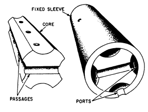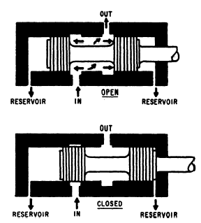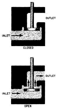 Figure 6-21.Operation of a simple poppet valve. seated (shut). The action of the poppet is similar to that of the valves in an automobile engine. In most valves the poppet is held in the seated position by a spring.The valve consists primarily of a movable poppet which closes against the valve seat. In the closed position, fluid pressure on the inlet side tends to hold the valve tightly closed. A small amount of movement from a force applied to the top of the poppet stem opens the poppet and allows fluid to flow through the valve.The use of the poppet as a-valving element is not limited to directional control valves.Rotary Spool The rotary spool directional control valve (fig. 6-22) has a round core with one or more passages or recesses in it. The core is mounted within a stationary sleeve. As the core is rotated within the stationary sleeve, the passages or recesses connect or block the ports in the sleeve. The ports in the sleeve are connected to the appropriate lines of the fluid system.Sliding spool The operation of a simple sliding spool directional control valve is shown in figure 6-23. The valve is so-named because of the shape of the valving element that slides back and forth to block and uncover ports in the housing. (The sliding element is also referred to as a piston.) The inner piston areas (lands) are equal. Thus fluid under pressure which enters the valve from the inlet ports