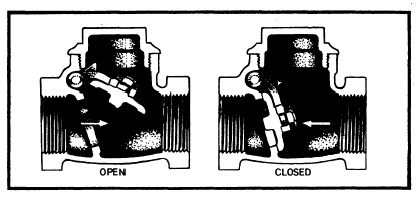 Figure 6-24.Swing check valve. Figure 6-24 shows a swing check valve. In the open position, the flow of fluid forces the hinged disk up and allows free flow through the valve. Flow in the opposite direction with the aid of gravity, forces the hinged disk to close the passage and blocks the flow. This type of valve is sometimes designed with a spring to assist in closing the valve.The most common type of check valve, installed in fluid-power systems, uses either a ball or cone for the sealing element (fig. 6-25). As fluid pressure is applied in the direction of the arrow, the cone (view A) or ball (view B) is forced off