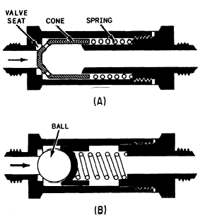 Figure 6-25.Spring-loaded check valves. its seat, allowing fluid to flow freely through the valve. This valve is known as a spring-loaded check valve.The spring is installed in the valve to hold the cone or ball on its seat whenever fluid is not flowing. The spring also helps to force the cone or ball on its seat when the fluid attempts to flow in the opposite direction. Since the opening and closing of this type of valve is not dependent on gravity, its location in a system is not limited to the vertical position.A modification of the spring-loaded check valve is the orifice check valve (fig. 6-26). This