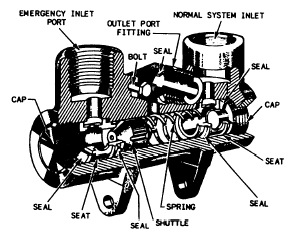 SHUTTLE VALVE In certain fluid power systems, the supply of fluid to a subsystem must be from more than one source to meet system requirements. In some systems an emergency system is provided as a source of pressure in the event of normal system failure. The emergency system will usually actuate only essential components.The main purpose of the shuttle valve is to isolate the normal system from an alternate or emergency system. It is small and simple; yet, it is a very important component.Figure 6-27 is a cutaway view of a typical shuttle valve. The housing contains three ports normal system inlet, alternate or emergency system inlet, and outlet. A shuttle valve used to operate more than one actuating unit may contain additional unit outlet ports. Enclosed in the housing is a sliding part called the shuttle. Its purpose is to seal off either one or the other inlet ports. There is a shuttle seat at each inlet port.