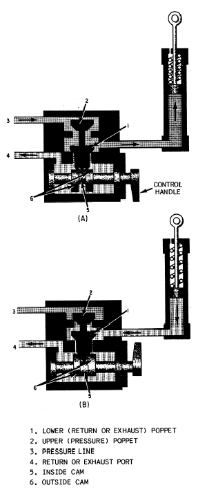Figure 6-27.Shuttle valve. When a shuttle valve is in the normal operation position, fluid has a free flow from the normal system inlet port, through the valve, and out through the outlet port to the actuating unit. The shuttle is seated against the alternate system inlet port and held there by normal system pressure and by the shuttle valve spring. The shuttle remains in this position until the alternate system is activated. This action directs fluid under pressure from the alternate system to the shuttle valve and forces the shuttle from the alternate system inlet port to the normal system inlet port. Fluid from the alternate system then has a free flow to the outlet port, but is prevented from entering the normal system by the shuttle, which seals off the normal system port.The shuttle may be one of four types: (1) sliding plunger, (2) spring-loaded piston, (3) spring-loaded ball, or (4) spring-loaded poppet. In shuttle valves that are designed with a spring, the shuttle is normally held against the alternate system inlet port by the spring.TWO-WAY VALVES The term two-way indicates that the valve contains and controls two functional flow control ports-an inlet and an outlet. A two-way, sliding spool directional control valve is shown in figure 6-23. As the spool is moved back and forth, it either allows fluid to flow through the valve or prevents flow. In the open position, the fluid enters the inlet port, flows around the shaft of the spool, and through the outlet port. The spool cannot move back and forth by difference of forces set up within the cylinder, since the forces there are equal. As indicated by the arrows against the pistons of the spool, the same pressure acts on equal areas on their inside surfaces. In the closed position, one of the pistons of the spool simply blocks the inlet port, thus preventing flow through the valve.A number of features common to most sliding spool valves are shown in figure 6-23. The small ports at either end of the valve housing provide a path for any fluid that leaks past the spool to flow to the reservoir. This prevents pressure from building up against the ends of the pistons, which would hinder the movement of the spool. When spool valves become worn, they may lose balance because of greater leakage on one side of the spool than on the other. In that event, the spool would tend to stick when it is moved back and forth. Small grooves are therefore machined around the sliding surface of the piston; and in hydraulic valves, leaking liquid will encircle the pistons and keep the contacting surfaces lubricated and centered.THREE-WAY VALVES Three-way valves contain a pressure port, a cylinder port, and a return or exhaust port. The three-way directional control valve is designed to operate an actuating unit in one direction; it permits either the load on the actuating unit or a spring to return the unit to its original position.Cam-Operated Three-Way Valves Figure 6-28 shows the operation of a cam-operated, three-way, poppet-type directional control valve. View A shows fluid under pressure forcing the piston outward against a load. The upper poppet (2) is unseated by the inside cam (5), permitting fluid to flow from the line (3) into the cylinder to actuate the piston. The lower poppet (1) is seated, sealing off the flow into the return line (4). As the force of the pressurized fluid extends the piston rod, it also compresses the spring in the cylinder.View B shows the valve with the control handle turned to the opposite position. In this position, the upper poppet (2) is seated, blocking the flow of fluid from the pressure line (3). The lower poppet (1) is unseated by the outside cam (6). This releases the pressure in the cylinder and allows the spring to expand, which forces the piston rod to retract. The fluid from the cylinder flows through the control valve and out the return